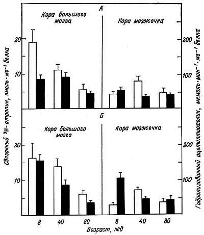 Рис. 5.9. Специфическое связывание 3Н-атропина с синаптосомальными фракциями (светлые столбики) и гидролиз ацетилтиохолина (темные столбики) в коре большого мозга и коре мозжечка у крыс-самок (А) и самцов (Б) разного возраста [28]