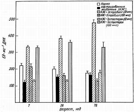 Пока еще не существует методов регенерации таких органов, как скелетная мышца, сердце и мозг, клетки которых являются постмитотическими. В этих органах также наблюдаются нарушения в индукции ферментов. Каким образом можно устранить подобные повреждения? Были сделаны попытки использовать разные уровни гормонов, наблюдающиеся в разные периоды жизни. Содержание пируваткиназы в мозгу, сердце и скелетных мышцах у незрелых крыс обоего пола высокое, но оно уменьшается по окончании периода развития [16, 17]. Кастрация приводит к уменьшению количества фермента. Если крысам давать 17β-эстрадиол (50 мкг на 100 г веса тела), то содержание фермента у старых крыс возрастает до уровня, характерного для среднего возраста (рис. 5.10). Величина индукции зависит от пола и типа ткани. Тестостерон в дозе 10 мкг на 100 г веса увеличивает до такого же уровня содержание холин-ацетилтрансферазы в полушарии головного мозга самок крыс после овариэктомии (рис. 5.11). В этом случае также наблюдается зависимость от пола [27]. Эти работы показывают, что уменьшение содержания некоторых ферментов то окончании репродуктивного периода можно предотвратить путем введения гормонов. Однако такое воздействие следует предпринимать с осторожностью, так как гормон может увеличить содержание интересующего исследователя фермента, но, кроме того, оказать какое-либо побочное действие, которое может принести вред организму. К тому же неизвестно, замедлится ли основной процесс старения при залечивании одного какого-либо дефекта.