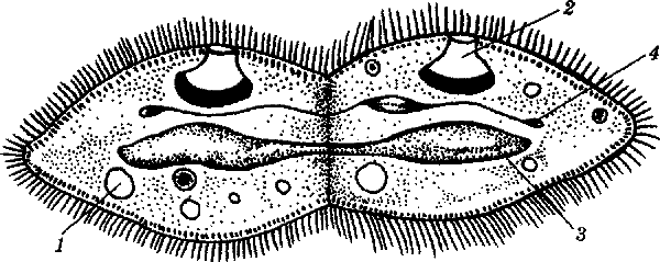 Деление инфузории: 1 — сократительная вакуоль; 2 — рот; 3 — делящееся большое ядро; 4 — делящееся маленькое ядро (у многих инфузорий в клетках по два ядра)