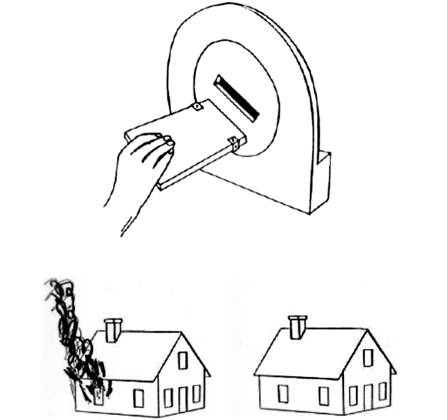 Рисунок 9. Первые свидетельства того, что неосознаваемые данные проходят обработку в коре, были получены в результате работы с пациентами, у которых пострадал головной мозг. Пациентка Гудейла и Милнера (1991), обозначенная как Д.Ф., в результате повреждения мозга утратила способность распознавать зрительные образы и полностью разучилась узнавать и описывать формы предметов, даже таких простых, как наклонная прорезь. Тем не менее она точным движением вкладывала в эту прорезь карту — по-видимому, сложными движениями руки мозг управлял бессознательно. Пациент Маршалла и Халлигана (1988) П.С., страдавший обширным левосторонним пространственным игнорированием, не способен был осознать разницу между двумя приведенными на картинке изображениями домов. Тем не менее, когда его спрашивали, в каком из них он предпочел бы жить, он никогда не указывал на дом, охваченный огнем, а значит, можно предположить, что он способен был схватить смысл изображения, сам того не осознавая