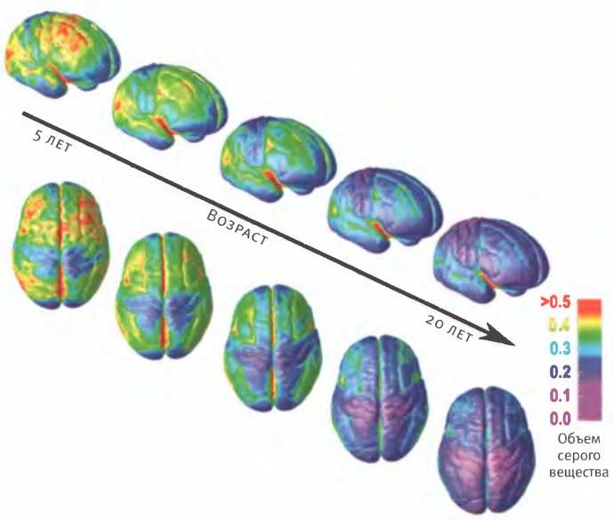 Мозг развивается от задних отделов (в основном задействованных в работе органов чувств и движениях) к передним (задействованных в принятии решений, рассудочной деятельности и планировании). Входе развития серое вещество истончается в результате подрезания лишних нейронов, но связи между оставшимися нейронами становятся все плотнее и надежнее за счет образования чехлов из жироподобного вещества миелина10.