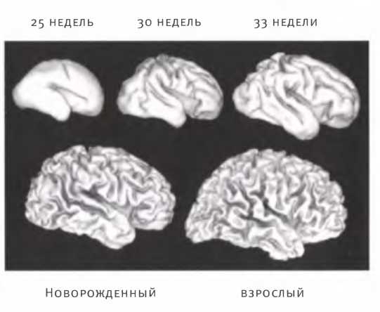 По мере созревания мозга он становится все плотнее и образует сложную систему выпуклостей (извилин) и углублений (борозд).