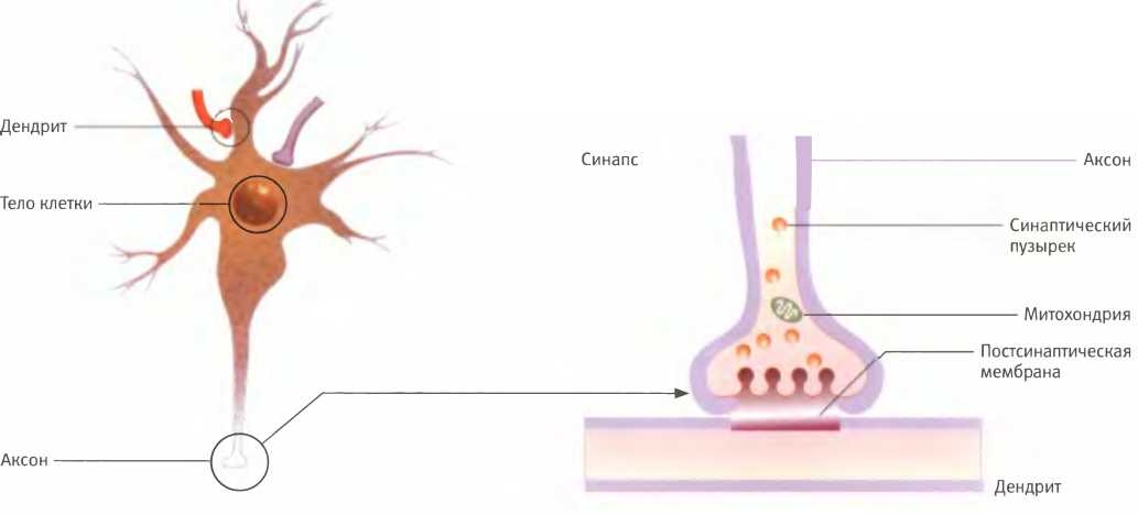 При еще большем увеличении можно увидеть крошечную щель, отделяющую каждый дендрит от соприкасающегося с ним аксона. Участки таких соприкосновений называют синапсами. Чтобы через синапс прошел электрический сигнал, аксон, по которому поступает этот сигнал, выделяет в синаптическую щель особые вещества — нейромедиаторы. Среди нейромедиаторов есть и делающие клетку, на которую они передают сигнал, менее активной, но есть и вызывающие ее возбуждение, так что возникающие в результате работы множества возбуждающих синапсов цепные реакции обеспечивают одновременную активацию миллионов связанных друг с другом клеток мозга.