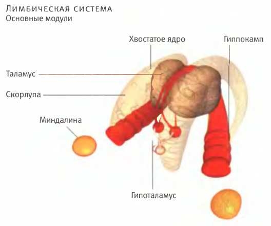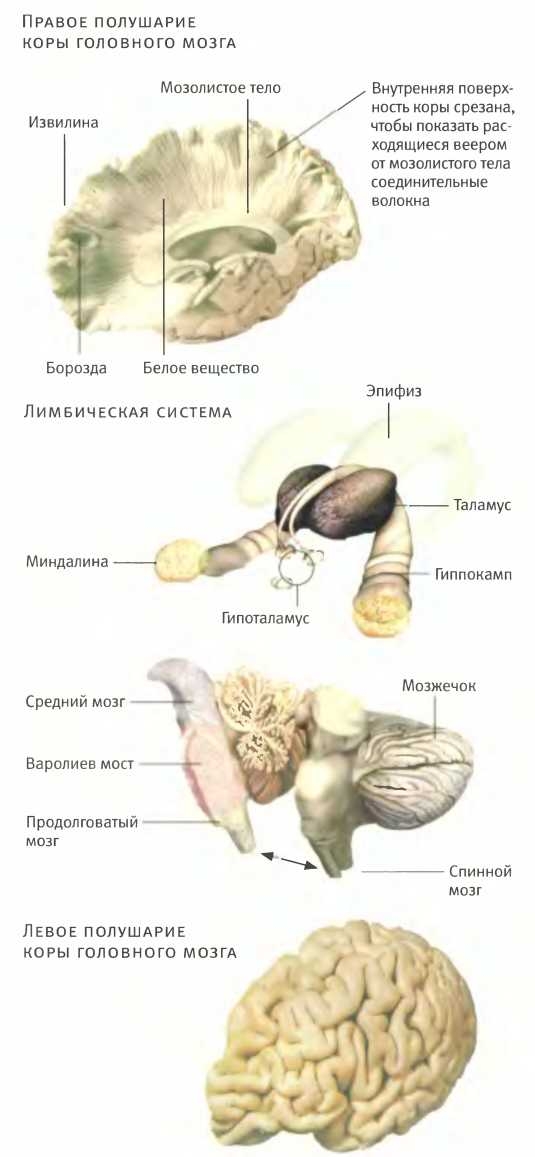 Самая заметная структура на внутренней поверхности каждой половинки разрезанного мозга — это изогнутая полоска белой ткани, образующей объемистую границу между складчатой корой и расположенной под ней системой модулей. Это мозолистое тело, соединяющее полушария друг с другом и играющее роль моста, по которому в обе стороны постоянно передается информация, так что обычно полушария работают как единое целое. Совокупность модулей, расположенных под мозолистым телом, называют лимбической системой. Эта система в эволюционном плане древнее коры, и ее иногда называют также “мозгом млекопитающих”, исходя из представлений о том, что она впервые возникла у древнейших млекопитающих. Работа этой части мозга, как и еще более древних его частей, расположенных под ней, совершается бессознательно, но оказывает сильнейшее воздействие на наши ощущения: лимбическая система тесно связана с расположенной над ней осознающей корой и постоянно посылает туда информацию.