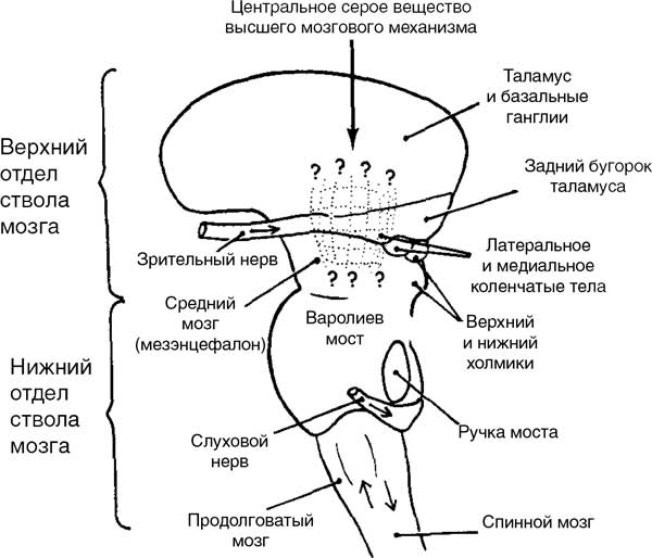 Поведение таких временных «автоматов» дает прекрасную возможность пристальнее взглянуть на второй механизм, сильно отличающийся от первого, который обеспечивает существование разума и мышления. Речь идет об автоматическом сенсорно-моторном механизме. Этот механизм также имеет свое центральное «представительство» в сером веществе верхнего отдела ствола мозга, где он вступает в тесное функциональное взаимодействие с механизмом разума. Сенсорно-моторный механизм расположен главным образом в верхнем отделе ствола мозга (см. рис. 10), однако он имеет, что совершенно очевидно, прямую связь с сенсорной и моторной частями коры мозга в обоих полушариях. Следовательно, имеются два мозговых механизма, серое вещество которых стратегически локализовано в промежуточном мозге или стволовой части мозга, а именно: а) механизм разума (или высший мозговой механизм); и б) компьютер (или автоматический сенсорно-моторный механизм).