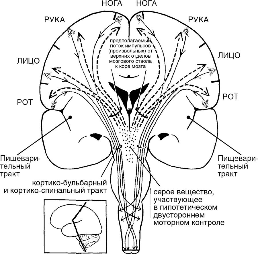Эта сильно упрощенная схема показывает лишь направление движения сигналов или команд, или иначе – моторной информации от механизма, осуществляющего двусторонний контроль над телом по указанию разума или в автоматическом режиме. Для выполнения этой функции механизм использует двигательные клетки-станции, расположенные в прецентральной извилине на обоих полушариях, как это показано на рисунке, где стрелки идут в соответствии с расположением подконтрольных частей тела от ноги вниз к лицу и рту. Весь этот механизм является частью центрэнцефалической интеграции и координации, обусловливающих эффективную деятельность разума. Кто-то может назвать его «человеческим компьютером». Именно благодаря этому «компьютеру» стали возможными многие человеческие способности (включая речь), которые человек освоил и зафиксировал в своем сознании в ранние периоды эволюции. Компьютер осуществляет надзор за поведением «человеческого автомата», когда разум занят чем-то другим либо когда высший мозговой механизм селективно инактивирован, как это случается при эпилептическом автоматизме. С другой стороны, эпилептический разряд, протекающий в его центральном сером веществе, расстраивает его функции, порождая активные ответные реакции в моторных центрах коры обоих полушарий, провоцируя тем самым генерализованную конвульсию (большой эпилептический приступ). (Рисунок Эленор Суизи.)