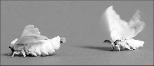 Прелюдия к спариванию тутового шелкопряда. Самка (слева) выпускает феромоны из железы в брюшке. Самец издалека обнаруживает запах своими усиками, возбуждается, распускает крылья и молниеносно приближается