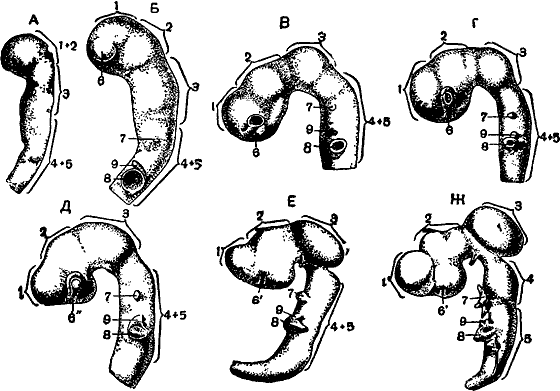 А — летучая мышь; Б — гиббон; В — человек; 1 — мозг; 2 — глазной пузырь; 3 — слуховой пузырь; 4 — жаберные складки; 5 — позвоночник; 6 — передняя конечность; 7 — задняя конечность; 8 — хвост; I–III — сравниваемые возрасты зародышей.