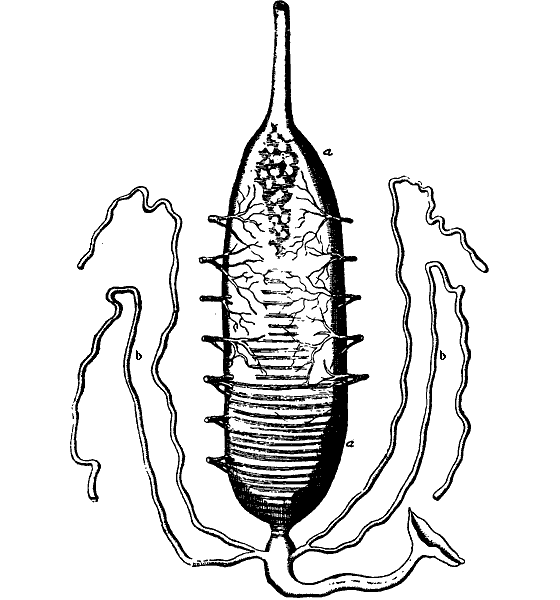 a, a — желудок с трахеями на его поверхности; b, b — «слепые кишки» (мальпигиевы сосуды). (Сваммердам, 1738).