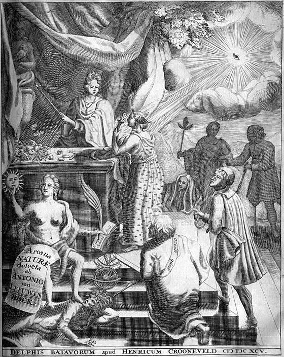 Фронтиспис из книги «Тайны природы» Левенгука (1695).