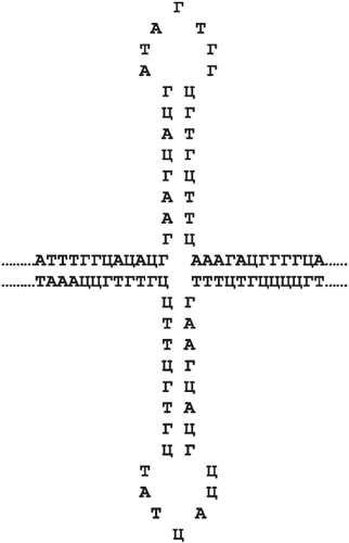 Особое свойство таких участков ДНК заключается в том, что при определенных состояниях ДНК они способны образовывать структуры, называемые крестами. На рис. 26 дан пример одного из таких возможных крестов.