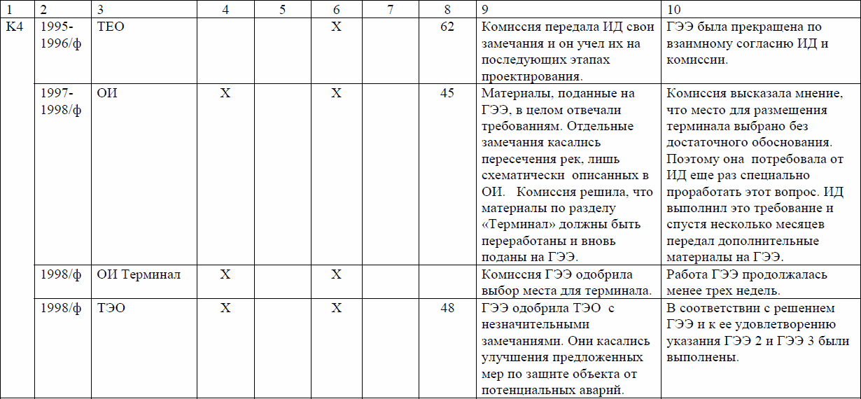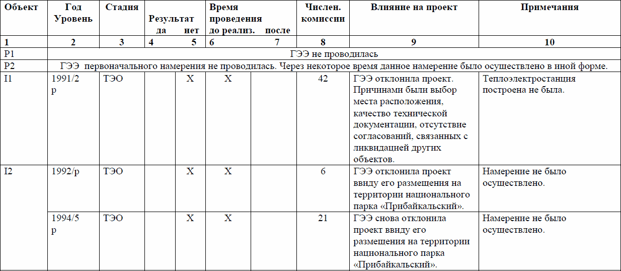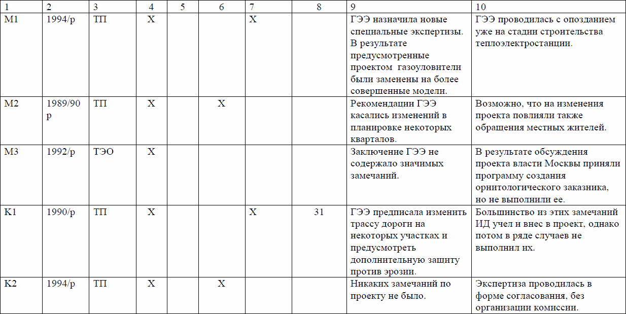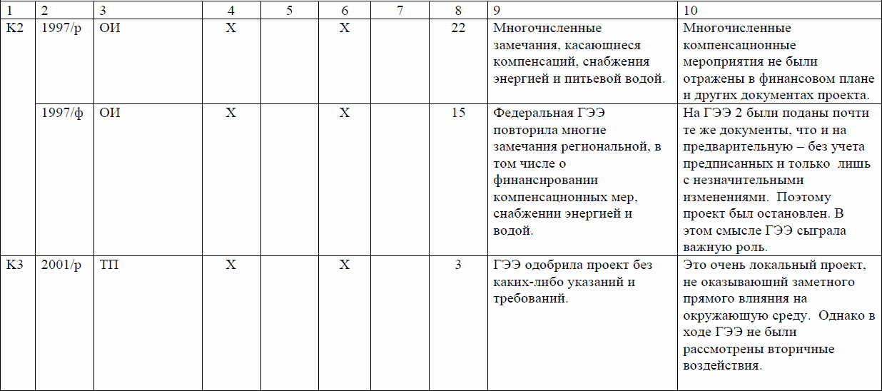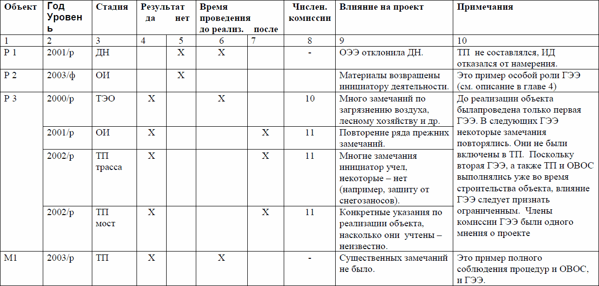 Из 21 ГЭЭ 16 почти не повлияли на реализацию проектов. Отчасти это объясняется, во-первых, особенностями самих проектов, значительная часть из которых потенциально не могла существенно повлиять на окружающую среду и не вызвала замечаний, во-вторых, улучшением качества представляемых на ГЭЭ материалов. Но последнему заключению противоречат свидетельства того, что в повторяющихся экспертизах одного и того же проекта нередко замечания экспертов тоже повторяются, и это означает, что инициатор проекта их не выполняет. Так поступают преимущественно государственные инициаторы деятельности, в то время как частные оказываются более дисциплинированными.