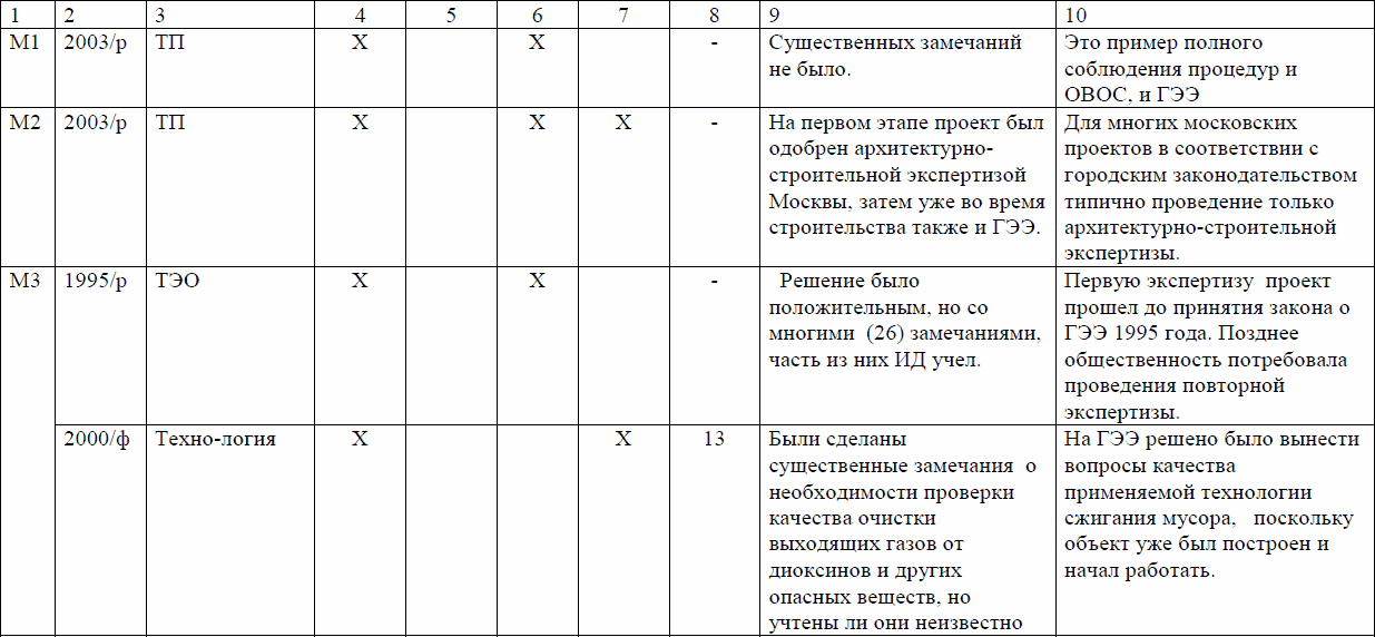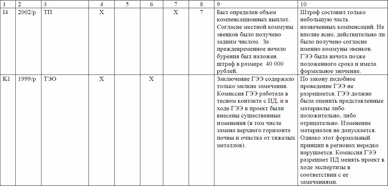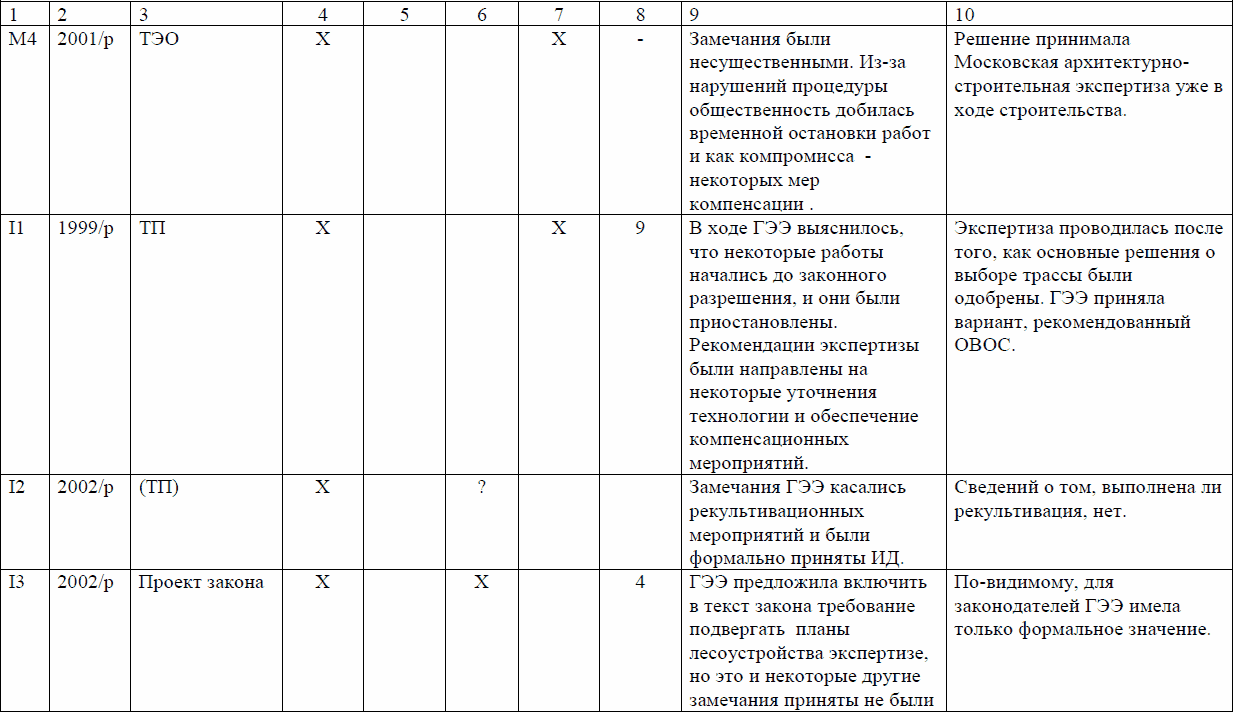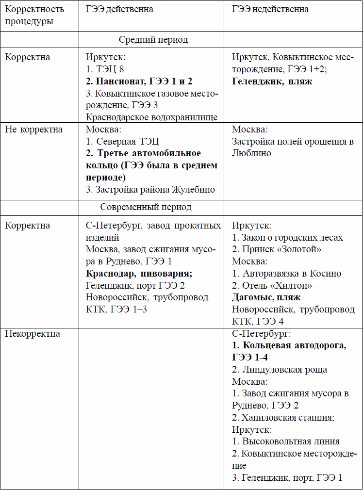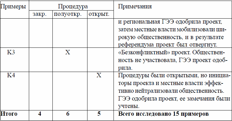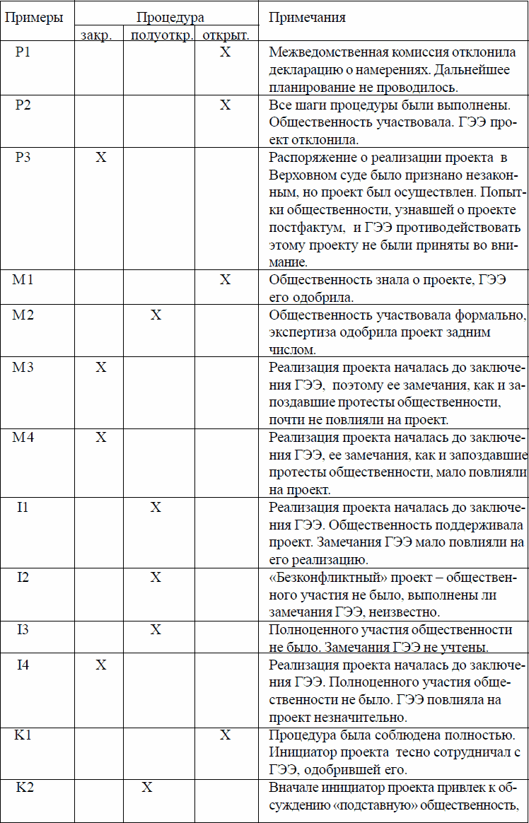 Эта таблица свидетельствует о том, что во всех случаях открытого проведения процедуры (а таковых из 15 случаев было только 5, т. е. одна треть) эффективность ГЭЭ достаточно высока, во всех же случаях закрытых процедур роль ГЭЭ и общественности весьма мала. В случаях «полуотрытых» процедур роль ГЭЭ по большей части также незначительна.
