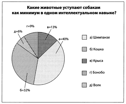 Итак, около трети участников опроса правильно угадали, что в некоторых отношениях кошки уступают собакам. Но еще больше процент тех, кто полагает, что шимпанзе не во всем умнее собак. На самом деле шимпанзе обходит собаку по большинству интеллектуальных навыков, но с одним важным исключением — собаки гораздо лучше умеют общаться с людьми.