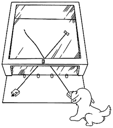 В схожем эксперименте собакам показывали кусочек еды, соскальзывающий по трубке в коробку. Кусочек скатывался в дальний угол ящика, достать пищу можно было только через дверцу в стенке, дальней от трубки. Затем в ящик вставлялась перегородка, делившая его на две части. Теперь еду можно было достать только через другую дверцу, расположенную ближе к месту скатывания.