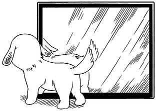 Собаки относятся к тем видам, которые не понимают природу зеркального отражения. Полаяв на зеркало и поискав за ним другую собаку, они быстро утрачивают к нему всякий интерес.