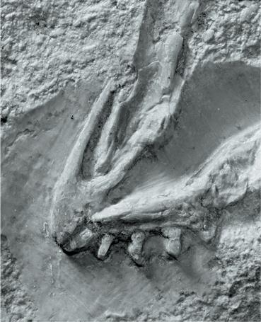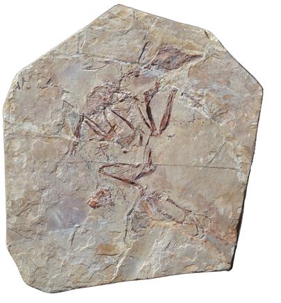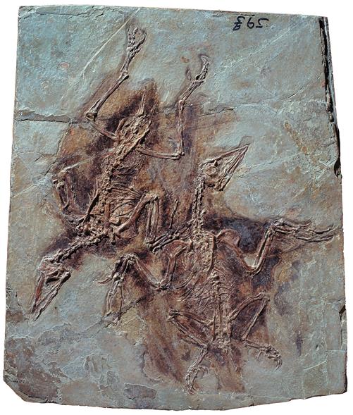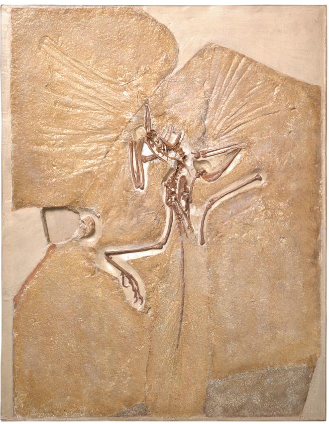 Этот археоптерикс из Музея естествознания в Лондоне был найден в 1861 г., и на фото ясно видны отпечатки больших маховых перьев вокруг костей передних конечностей. Длинные парные перья также растут с обеих сторон длинного хвоста