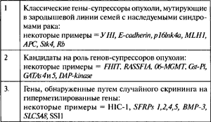 Перечень связанных с раком генов, на которые влияет упомянутое выше нарушение транскрипции, неуклонно растет. Как было описано ранее, сюда включаются гены в любых положениях на хромосомах (Jones and Baylin, 2002). Действительно, данное эпигенетическое изменение может сейчас численно превосходить те гены, которые часто мутируют в опухолях человека. Как было упомянуто ранее (табл. 24.1), потеря функции гена-супрессора опухоли как результат вызывающего сайленсинг данного гена метилирования CpG, по существу, затрагивает все известные пути. Чтобы понять значение генов для процесса канцерогенеза и сформулировать проблему в этой области на будущее, гены, по-видимому, могут быть разделены на три группы.