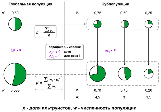 Еще одна замечательная хитрость такого рода называется парадоксом Симпсона. Суть этого парадокса в том, что при соблюдении определенного набора условий частота встречаемости альтруистов в группе популяций будет расти, несмотря на то, что внутри каждой отдельной популяции эта частота неуклонно снижается.