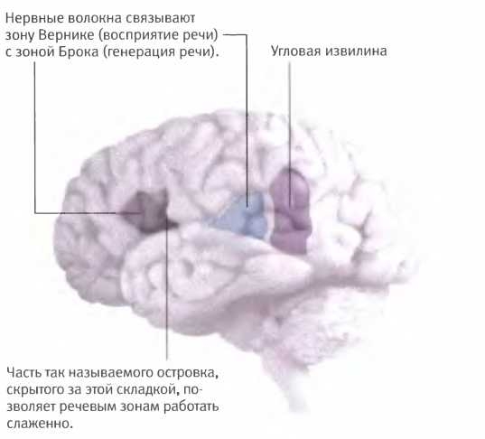 Речевые зоны нашего мозга располагаются преимущественно в левом полушарии, вокруг и над левым ухом. Главные из них — это зона Вернике, позволяющая нам разбирать слова других людей, зона Брока, позволяющая нам самим говорить (и, возможно, содержащая так называемый “грамматический модуль”), и угловая извилина, отвечающая за смысл.