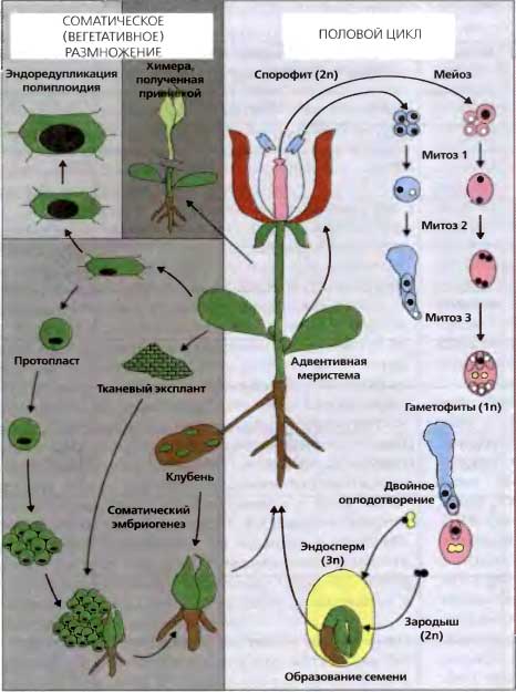 Растения могут размножаться половым путем (образование гамет, оплодотворение и образование семян (правая часть рисунка) и бесполым (соматическим) путем (вегетативное размножение, де- и редифференцировка или эмбриогенез (левая часть рисунка). Тело высшего растения (корни, стебель, цветок) — диплоидный спорофит. При мейозе число хромосом уменьшается вдвое. Если у животных продукты мейоза образуют гаметы без дальнейшего деления и они сливаются с образованием диплоидного ядра, то у растений образуются гаплоидные мужской или женский гаметофиты в результате двух или трех митотических делений, соответственно. В конечном итоге пыльцевая трубка содержит одно вегетативное (белое) и два генеративных (черные) ядра. Два генеративных ядра оплодотворяют яйцеклетку (черная) и формируется центральная клетка с диплоидным ядром, произошедшим в результате слияния двух полярных ядер (желтые) Таким образом, в результате этого двойного оплодотворения и образуются диплоидный зародыш и триплоидный эндосперм, который снабжает развивающийся зародыш питанием. После прорастания семени зародыш дает начало новому спорофиту. Кроме того, большинство растений способны размножаться вегетативно благодаря активации покоящихся латеральных меристем, выросту специализированных корневых структур (клубни), амплификации в тканевых культурах или даже регенерации из индивидуальных соматических клеток после удаления клеточной стенки (протопласты). У растений часто наблюдается эндоредупликация, которая приводит к образованию полиплоидных клеток или тканей Химерные растения можно получить с помощью прививки. Поэтому генетическая и эпигенетическая информация у растений проходит гораздо меньше четко определенных путей развития зародышевой линии, чем у животных