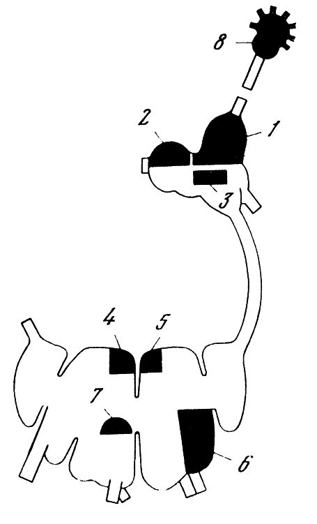 Рис. 10. Участки церебрального (1, 2, 3), левого париетального (4), правого париетального (5, 6), висцерального (7) и тентакулярного (8) ганглиев, подвергнутые электронно-микроскопическому исследованию (см. текст).
