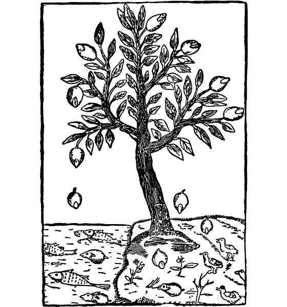 Впрочем, не один Геснер попал впросак с этой историей. Живший несколько позднее Геснера некий Дюре в 1605 году утверждал, что из плодов, упавших с дерева на землю, могут получиться птицы, а из тех же плодов в воде выведутся рыбы. Он даже дал рисунок, на котором весьма добросовестно изобразил постепенное превращение плодов в птиц и рыб. И если чему нужно удивляться, так это одному: как это Дюре не попал в «отцы» эволюционного учения. Ведь он дал картину постепенного развития…