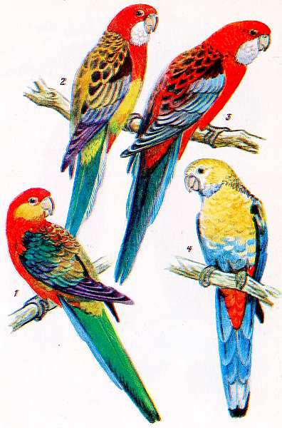 Таблица IV Желтощекая розелла (1), розелла (2), красная розелла (3) и бледноголовая розелла (4)