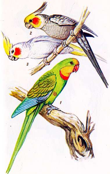 Таблица VII Серый попугай, или жако (1), и неразлучники: масковый (2) и Фишера (3)