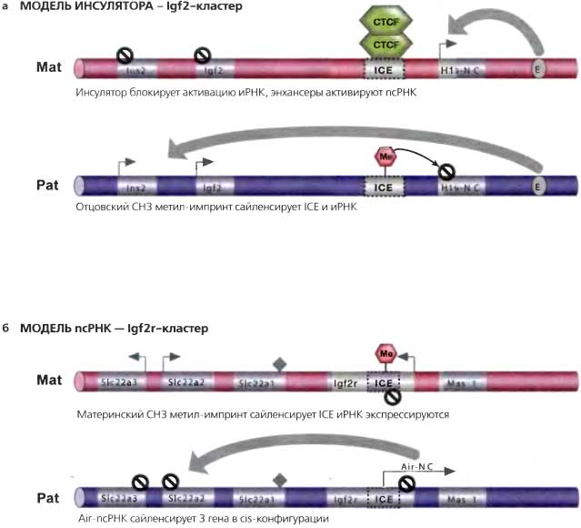 (а) Модель инсулятора для кластера Igf2. Показан паттерн экспрессии для эндодермы. На материнской хромосоме неметилированный ICE связывается с белком CTFC и формирует инсулятор, который не дает общим энхансерам эндодермы (Е) активировать Igf2 и Ins2. Вместо этого эти энхансеры активируют близлежащий промотор ncRNA Н19. На отцовской хромосоме метилированный ICE не может связываться с СТСЕ и инсулятор не образуется, вследствие чего гены иРНК Igf2 и Ins2 экспрессируются только на этой хромосоме. ncRNA Н19 метилируется, скорее всего, из-за распространения с удаленного на 2 т.о.метилированного ICE и является «молчащей», (б) модель ncRNA для кластера Igf2r. Показан паттерн экспрессии для плаценты. На материнской хромосоме метилированный ICE содержит промотор ncRNA Air, который прямо сайленсирован импринтом метилирования ДНК. Гены иРНК Igf2r, Slc22a2 и Slc22a3 экспрессируются только на этой хромосоме. Mas1 и Slc22a1 в плаценте не экспрессируются. На отцовской хромосоме промотор ncRNA Air, лежащий в неметилированном [СЕ, экспрессируется и сайленсирует Igf2r, Slc22a2 и Slc22a3 в cis. Заметьте, что в обеих моделях импринт метилирования ДНК сайленсирует ncRNA и делает возможной экспрессию иРНК: (ICE) — элемент контроля импринта (серый прямоугольник) — импринтированный ген иРНК, (ген-NC) — импринтированный ген ncRNA, (стрелка) экспрессированная аллель импринтированного гена, (черный запрещающий знак) — репрессированная аллель импринтированного гена, (заполненный ромб) — тканеспецифичныи ген, сайленсированныи на обеих родительских хромосомах, (серые стрелки) — удаленный эффект в cis-конфигурации