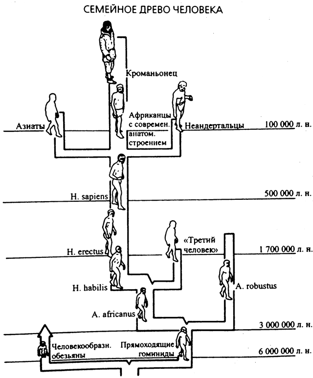 Рис. 2. Несколько ветвей нашего фамильного древа оборвались. В их числе — ветви, ведущие к Australopithecus robustus, неандертальцам, а также, возможно, к непонятному «третьему человеку» и к азиатской популяции Homo sapiens, жившей в одно время с неандертальцами. Ветвь, ведущая к современному человеку, идет от каких-то потомков Homo habilis. Для терминологического описания палеонтологических находок, относящихся к данной ветви, было произведено несколько произвольное разделение на Homo habilis, Homo erectus (палеонтологические находки, относящиеся ко временному периоду, начавшемуся около 1,7 миллионов лет назад) и Homo sapiens (находки возрастом около 500 000 лет). А. — род Australopithecus, Н. — род Homo.