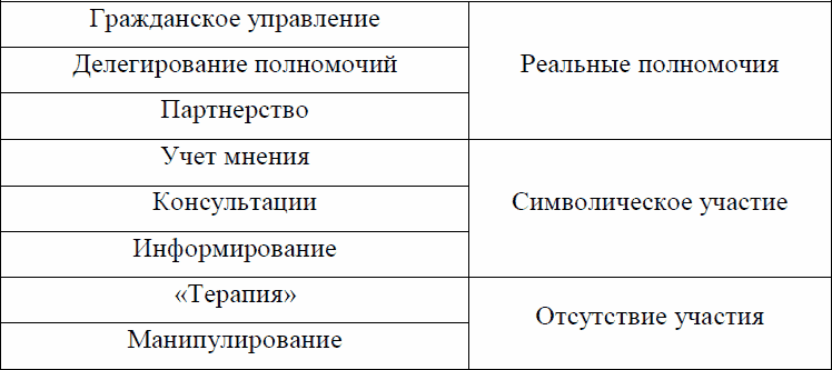 В работе Ш. Арнштейн «Лестница общественного участия» (1969) была предложена ставшая общепринятой классификация уровней общественного участия (табл. 1). Манипуляции (обман) и терапия (уговаривание) вообще не являются общественным участием. Достижение форм символического и реального участия невозможно без информирования.