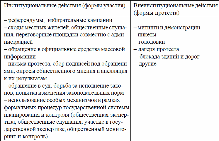 Подробнее различные формы действий охарактеризованы в главе 7, посвященной анализу конкретных изучавшихся нами примеров общественного участия.