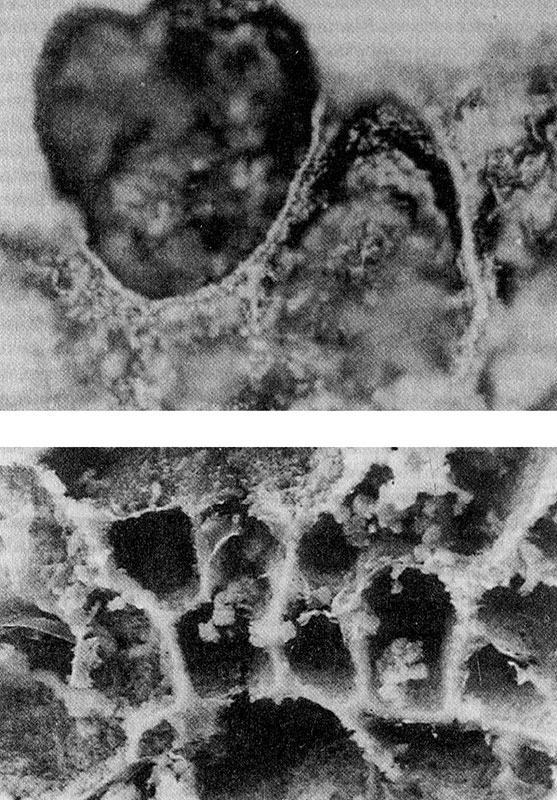 Рис. 8. Древние клетки с железо-серными мембранами, (а) Электронная микрофотография тонкого среза железо-серного минерала (пирита) из окрестностей деревни Тина (Ирландия), образовавшегося 360 миллионов лет назад, (б) Электронная микрофотография структур, образовавшихся в лабораторных условиях после впрыскивания раствора сульфида натрия (NaS), имитирующего гидротермальную жидкость, в раствор хлорида железа (FeCl2), имитирующего богатый железом древний океан