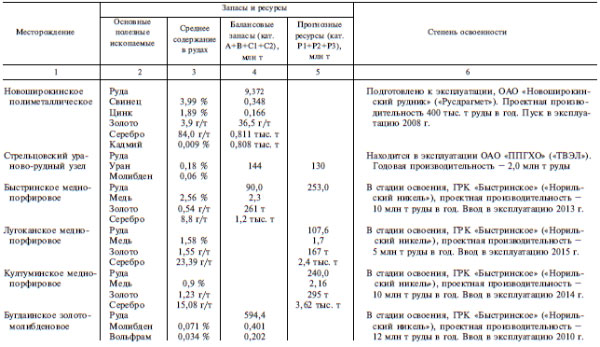 В восточной части приграничной территории края (Могочинский административный район) разведаны и эксплуатируются рудные и россыпные месторождения золота, разрабатывались месторождения молибдена (Давендинское), выявлен ряд перспективных на молибден рудных площадей (Костромихинское месторождение, Горбичанское рудоуправление, Усть-Кудеченское, Боровое рудные поля). Прогнозные ресурсы этой части территории края оцениваются по золоту в 911,3 тыс. т, по молибдену – 143,2 тыс. т, вольфраму – 119,0 тыс. т [Эпов и др., 2003].