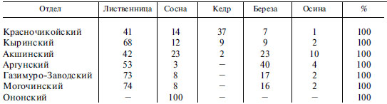 Лиственничные, лиственнично-сосновые, лиственнично-березовые, лиственнично-кедровые леса характеризуются различным соотношением основных лесообразующих пород (табл.6.22).