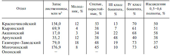 В восточных районах сосредоточено 50 % всех возможных для эксплуатации запасов лиственницы. Лесной фонд характеризуется, с одной стороны, значительными площадями покрытых лесом земель и общими запасами древесины, с дугой стороны, качественной разнородностью лесов с преобладанием лиственницы, территориальной разобщенностью лесосырьевых баз, небольшими площадями лесосек и размещением их на склонах, преобладанием древесины низких бонитетов, значительными площадями гарей, длительным периодом лесовосстановления из-за суровых природных условий.