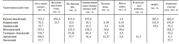Таким образом, лесной фонд 12 приграничных районов входит в структуру 7 лесничеств, поэтому лесные ресурсы приграничных районов и их использование рассматриваются по материалам учетов лесного фонда Красночикойского, Кыринского, Акшинского, Аргунского, Газимуро– Заводского, Могочинского, Ононского лесничеств Государственной службы лесного хозяйства Забайкальского края (табл. 6.20). В лесном фонде преобладают леса эксплуатационного назначения и их использование определено потребностями развития экономики края.