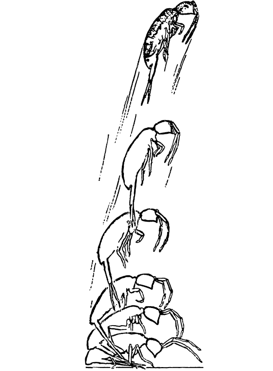 Другой вид окрашен в черный цвет и селится по краям стоячих вод. Эти размножаются здесь до такой степени, что кажется, весь берег осыпан порохом. Если одну из черных точек поместить на предметное стекло микроскопа, взору наблюдателя предстанет насекомое забавной формы с вилкой, подогнутой под конец брюшка. Вот эта вилка и помогает им совершать прыжки.
