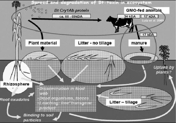 Особую тревогу вызвали исследования, показывающие снижение активности почвенных микроорганизмов на полях с ГМ-культурами. Итальянские учёные обнаружили исчезновение почвенных микроорганизмов на полях с ГМ-кукурузой (Bt11 и Bt176) (Castaldini et al. 2005, Turini et al., 2008). В других исследованиях было показано, что Bt-культуры могут приводить к угнетению роста, размножения и к высокой смертности дождевых червей (Викторов. Обзор, 2009). Известно, что дождевые черви обеспечивают утилизацию растительного опада. Объём переносимой этими животными почвы варьирует от 2 т/га до 250 т/га в год. Исчезновение жизненно важных почвенных организмов ведёт к деградации и опустыниванию почв.