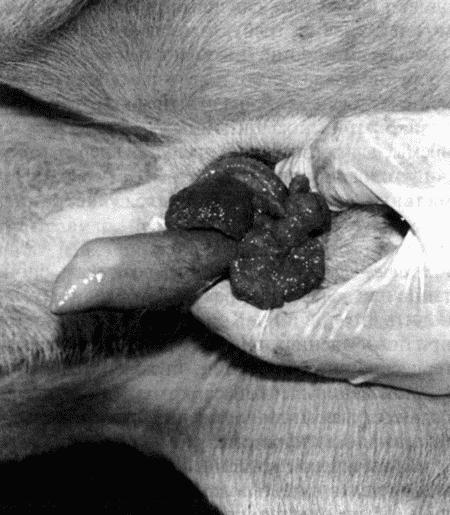 Трансмиссивная венерическая саркома (ТВС) представляет собой опухоль слизистой оболочки (фиг. 7.3), поражающую наружные половые органы и другие слизистые покровы. Наблюдается как у кобелей, так и у сук, в основном в странах с тропическим и субтропическим климатом. Однако в связи с расширением международных связей все чаще регистрируется и в других странах. В настоящее время ТВС распространена в странах Средиземноморья и на юге Франции. Источником инфекции являются собаки-производители. Для самцов типично поражение пениса и препуция, однако ТВС может возникать и на других участках, например, на слизистых оболочках ротовой полости, что объясняется вылизыванием гениталий. Инкубационный период продолжается от нескольких недель до нескольких месяцев, после чего развивается рыхлая опухоль красновато-серого цвета. В начале заболевания диаметр узелков достигает нескольких миллиметров, но они быстро разрастаются и приобретают сходство с цветной капустой, становясь сосковидными и на ножке. Через несколько месяцев возможна спонтанная регрессия.