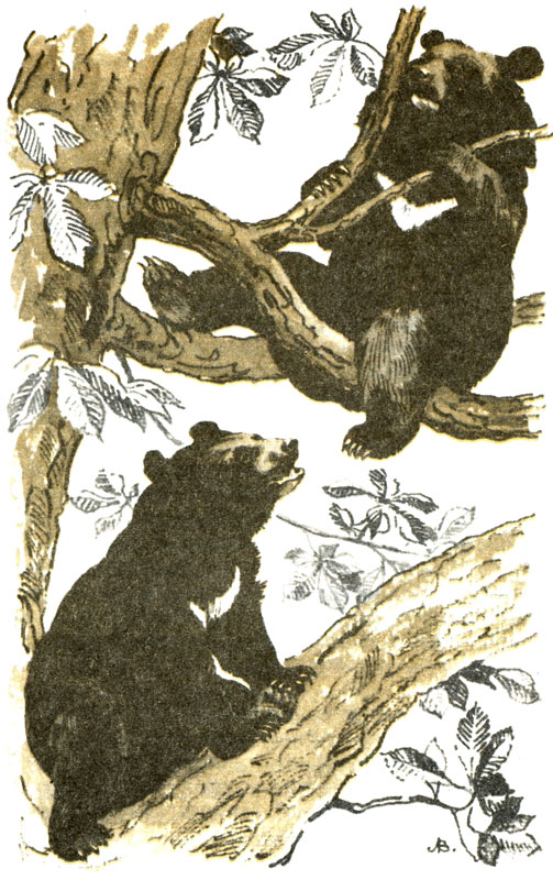 Известно, что бурый медведь лишь в своей ранней молодости лазает по деревьям. А вот черные это делают всю жизнь одинаково ловко. Когти у них большие, крепкие, круто загнутые и острые, а лапы, особенно передние, очень сильные. На вершину самого большого дерева ему забраться — а в уссурийской тайге есть и 30-метровые гиганты — ровно ничего не стоит. Ну, а вниз с такой высоты спуститься с высокого прямоствольного дерева он может за несколько секунд, с высоты 4–6 метров спрыгивает без труда и боязни.