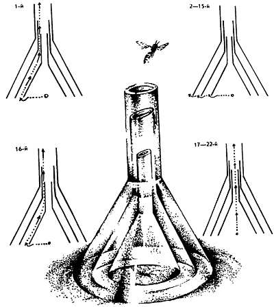 Но это был филант и недоумевать не мог. Покружив, он улетел. Процедура со снятием трехслойного стеклянного лабиринта во время отлучки филанта для охоты и с установкой его на место после возвращения повторялась еще много раз. И филант тоже исправно повторял маневр, прокладывая тоннель под краями трех воронок. Только однажды, попытавшись ограничиться подкопом под край внутренней воронки, он вновь оказался зажат стеклянными стенками и, пешим ходом поднявшись вверх, через трубки Б и В вышел на волю. Зато все последующие выходы — в нору подумать, что оса разобралась в ситуации, оказались самыми простыми. Охотница выбиралась из гнезда, недолго бегала в окаймленном стеклом круге, затем поднималась по внутренней стенке внутренней воронки через полую трубку А в трубку Б, отсюда в полую трубку В… В общем, уходила в рейс кратчайшим путем.