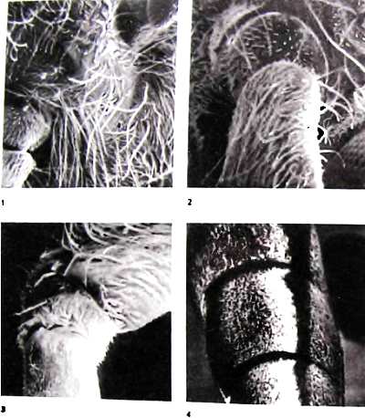 Помните, у М. В. Ломоносова: «Открылась бездна звезд полна. Звездам числа нет, бездне — дна»? Эти строки приходят на ум, когда рассматриваешь сделанные с помощью сверхмикроскопа фотоснимки поверхности усика, велика ли вся оса? А ее усик? Но вот что обнаруживают здесь увеличения. Слева направо вверху — увеличения в 500 и 1000 риз, внизу — в 2000 и 5000 раз… Все эти волоски-сенсиллы, обонятельные ямки и бугорки имеют свое назначение, помогают осам в лётных рейсах.