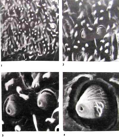 В подписи к фотографии, сделанной с помощью сверхмикроскопа (см. стр. 157), показан был вытянутый над левым сложным глазом осы усик — антенна. Здесь помещаются сделанные с разным увеличением снимки того участки головной капсулы, от которого отходят основания обоих усиков. Увеличение в 50, 100 и 200 раз.