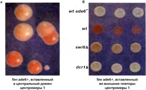 (а) Экспрессия ade6+ из центрального домена носит мозаичный характер, давая в результате красные, белые и секторированные колонии. Клетки, экспрессирующие ade6+, образуют белые колонии; когда же ade6+ репрессирован, образуются красные колонии, (б) ade6+, вставленный во внешние повторы, накрепко сайленсирован, что в результате дает однородные красные колонии. Для этого сайленсинга требуются белки гетерохроматина, такие как Swi6 (который связывается с метилированным H3K9). и компоненты RNAi, такие как Dcr1 (Dicer, РНКаза-III-рибонуклеаза)