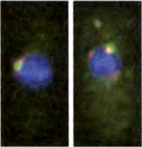Два интерфазных ядра с гетерохроматином (центромеры, теломеры и «молчащие» локусы mat2-mat3), декорированных красной флуоресцентной иммунолокализацией Swi6, и кинетохорный хроматин (только центромеры), декорированный зеленой флуоресцентной иммунолокализацией CENP-ACnp1. Красные сигналы не в самом соседстве с зелеными представляют теломеры или mat2-mat3. Все нентромеры собраны в кластер на периферии ядра рядом с организующим центром митотического веретена