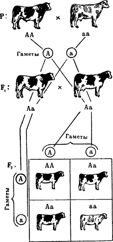 Каждая из гамет одного родителя может встретиться с любой гаметой другого, причем шансы для встречи гена А с А или а равны. В результате же примерно на трех черно-пестрых телят (АА+Аа+Аа) получается один красно-пестрый (аа). Животные с формулой АА и аа, у которых гены парные, называются гомозиготными, а животные типа Аа — гетерозиготными.