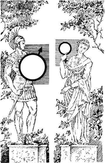 Бык Брауна отличной черно-пестрой окраски. Такой же четкий цвет имели и коровы. Откуда же красно-пестрые телята? В этом лучше всего разобраться на опыте, поставив специальные скрещивания. Коров мы возьмем красно-пестрых, быка — такого, у которого никогда ни от каких коров красно-пестрых телят не рождалось. Сейчас мы будем писать схемы, а потому условимся. Поколение, с которого мы начинаем, в генетике называется родительским и отмечается на схемах буквой Р («П» латинское). Следующее поколение называют первым гибридным или просто первым и обозначают буквой F1. Второе поколение — F2, третье — F3 и т. д. А для обозначения самцов и самок генетики позаимствовали значки у астрономов. ? — зеркало Венеры означает «самка», ? — меч Марса — «самец», ? — знак скрещивания. Итак: