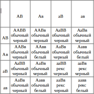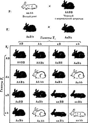 Если рассматривать наследование каждого из признаков по отдельности, то во втором поколении получится 3: 1, то есть на трех кроликов с обычной шерстью придется один рекс, а на трех черных — один белый. Но нас интересует совместное наследование двух пар признаков, гены которых находятся в разных хромосомах (о наследовании в тех случаях, когда пара генов находится в одной хромосоме, расскажу ниже).